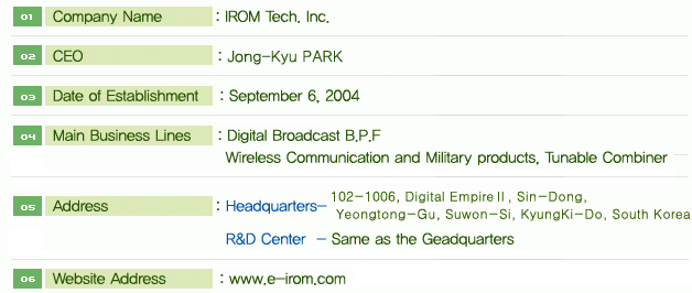including RF components and units for mobile communication and parts for military defense systems. Since its incorporation in 2004, the company has focused on developing and manufacturing band pass filters and combiners for broadcasting as its flagship products.